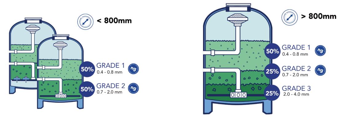 對(duì)于較小的過濾器(< Ø 800 mm 直徑)和所有帶有噴嘴板床的過濾器,無論過濾器直徑如何:使用 50% 的AFM®ng1 級(jí)和 50% 的 AFM®ng2 級(jí)。